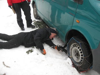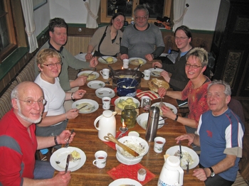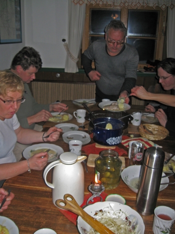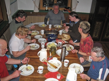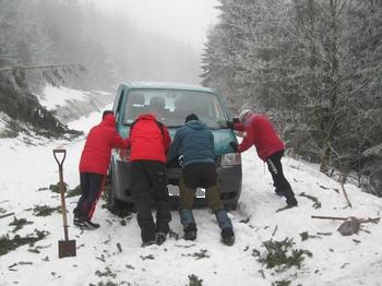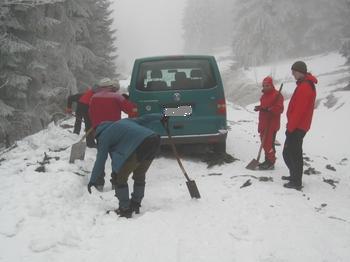 Februar 2011, kalt, bis zur Hütte fast kein Schnee, dafür viele Stunden das Transportfahrzeug aus einer Schneedelle gewühlt. Essen und Trinken war dann umso besser.